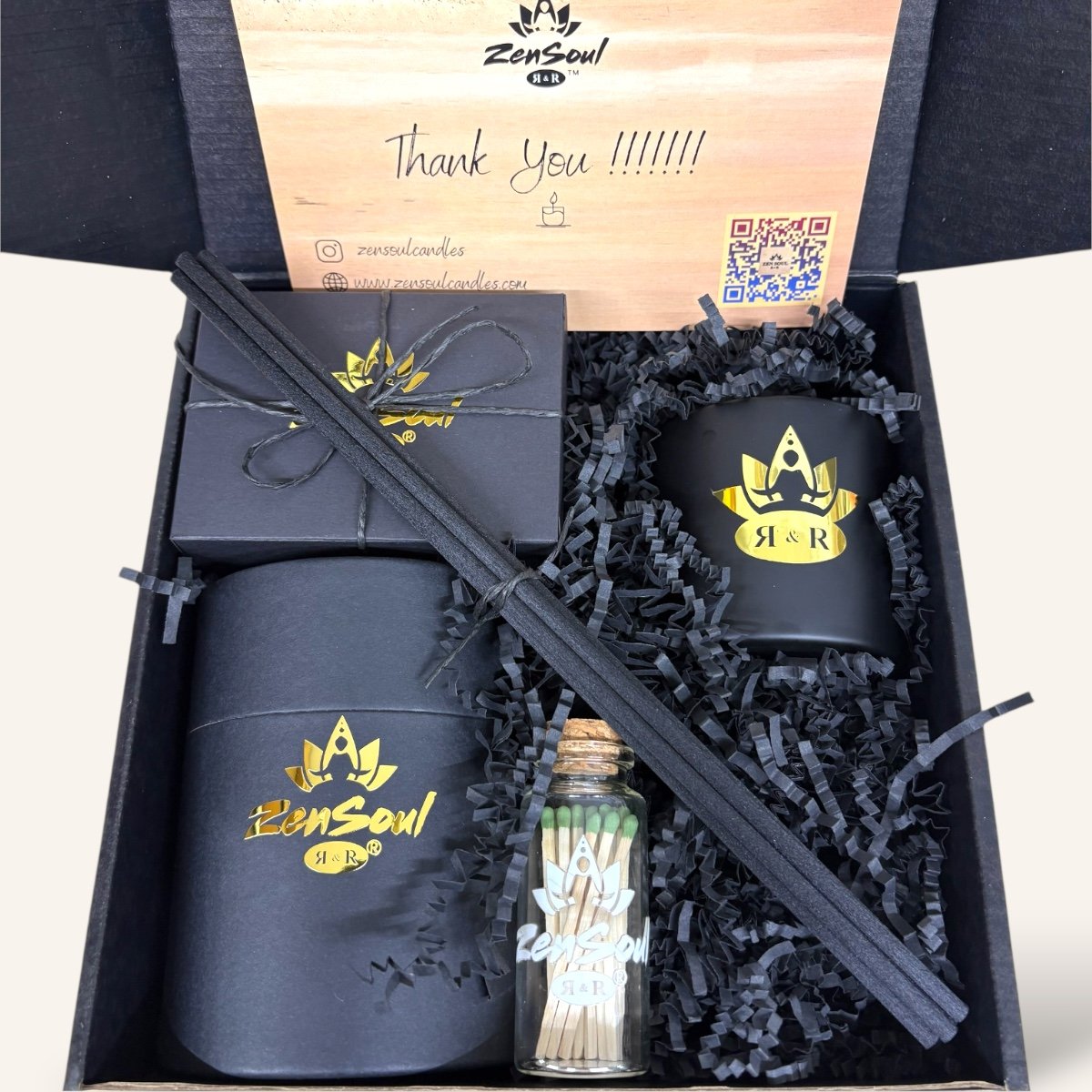 The Serenity Noir Luxury Black Aromatherapy Gift Set blends sophisticated design with mindful wellness. Each piece is handcrafted in small batches using a sustainable, 100% vegan soy and coconut wax blend, infused with premium fragrance and essential oils.